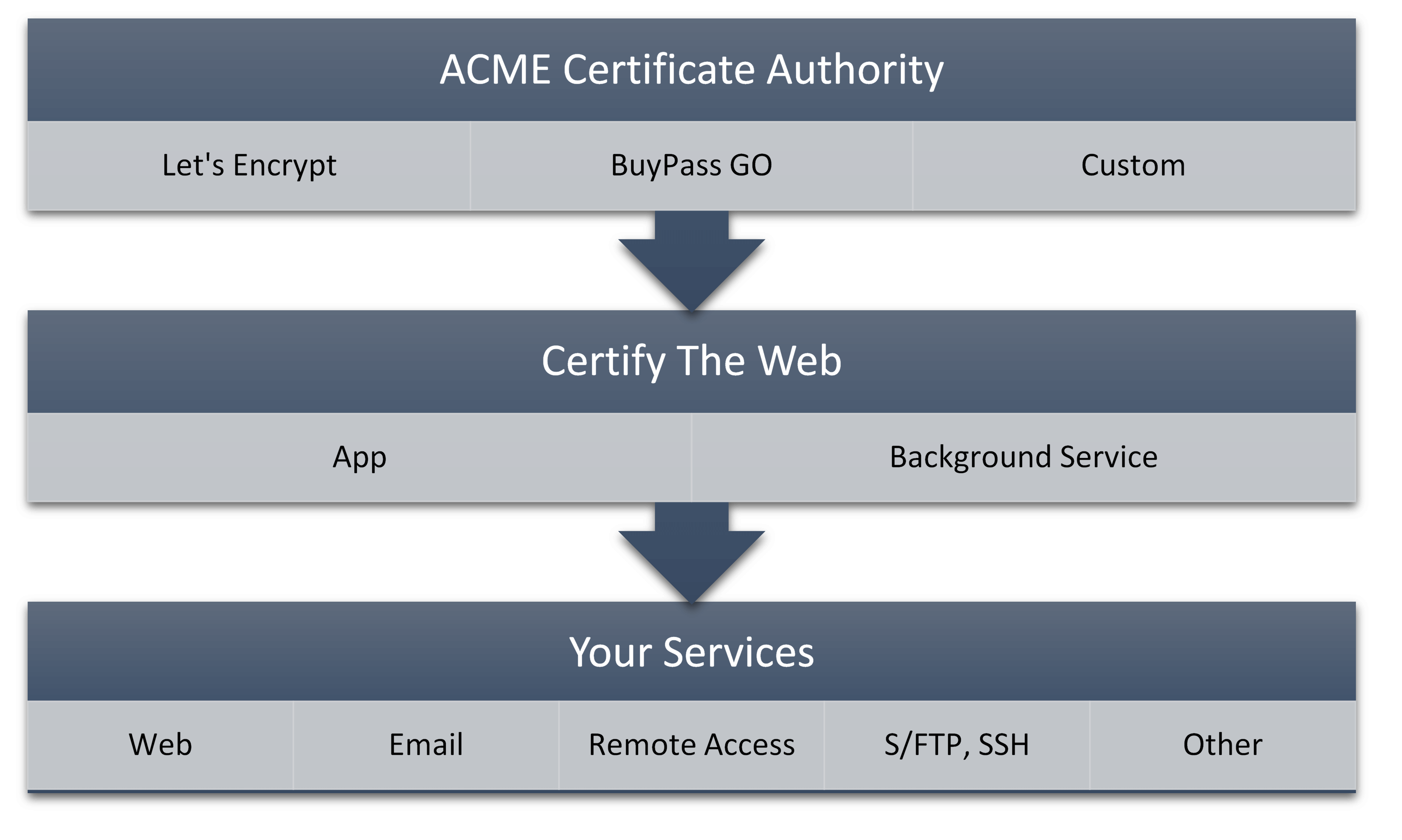 You can let the app auto-renew certificates then automatically deploy them to the services that use the certificates (e.g. IIS websites).