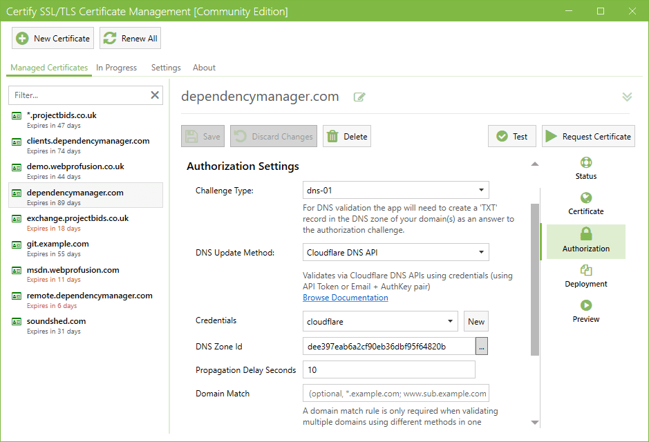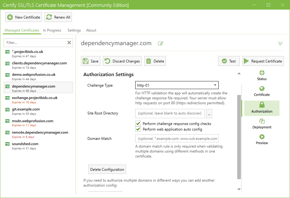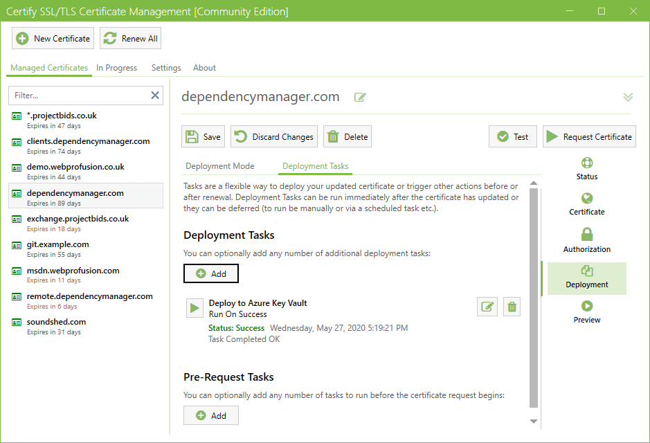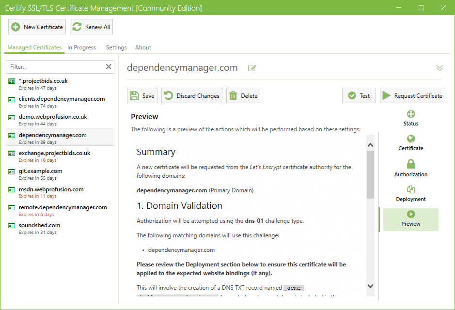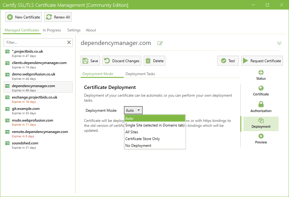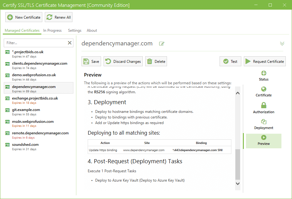 Whether you need simple auto deployment to IIS or advanced deployment to other services/servers or remote certificate stores, Certify The Web has extremely powerful options for sophisticated deployment.
