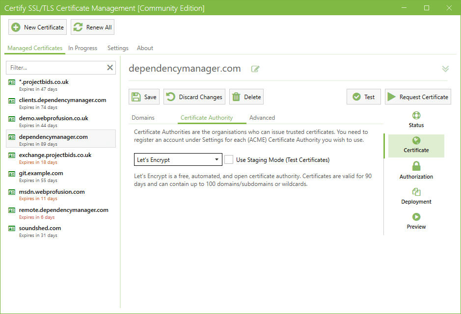If required, each Managed Certificate can use a different Certificate Authority and you can mix use of Production or Staging (Test) certificates.