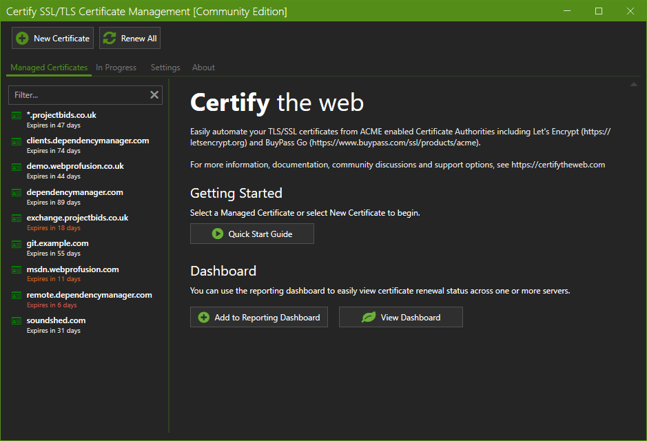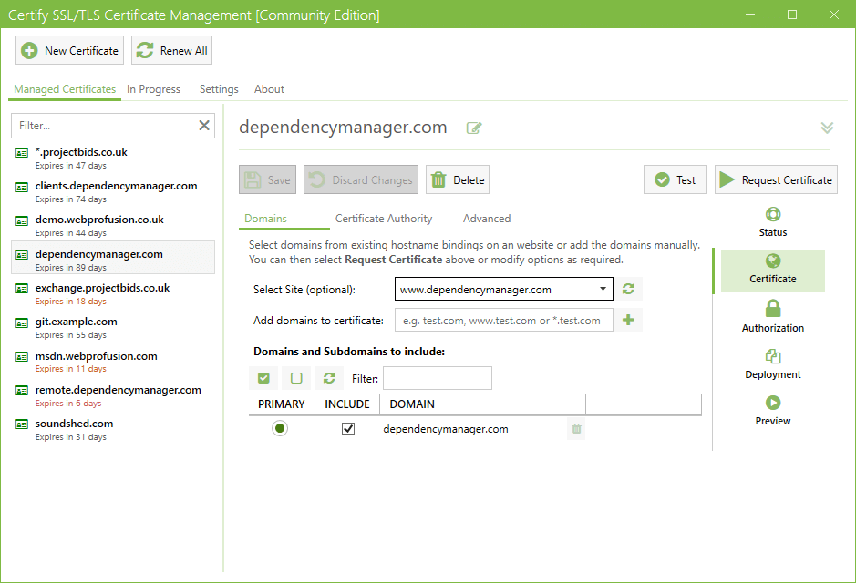 Each certificate may cover multiple domains. You can easily add or remove domains from a certificate and auto-populate the list of domains from existing website bindings (e.g. IIS).