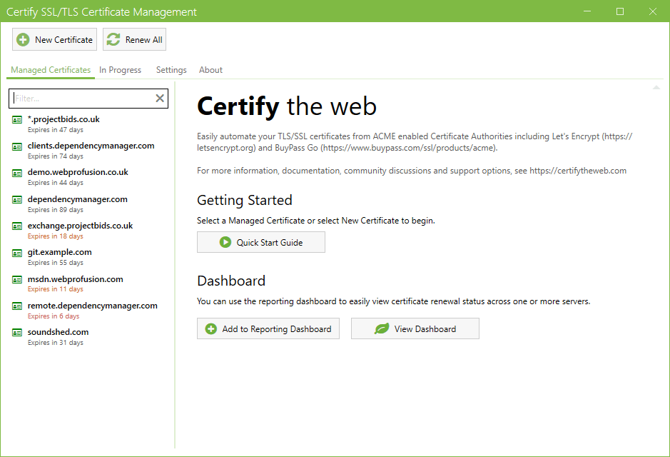 Simply install the app on your server, setup the domains you want to manage certificates for and let the Certify The Web software take care of renewing and (optionally) deploying certificates.